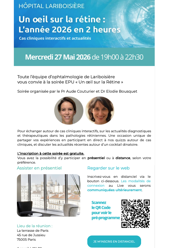 Les Ophtalmologistes du service d’Ophtalmologie de l’Hôpital Lariboisière ont développé une expertise particulière dans l’examen, le diagnostic et le traitement CHIRURGICAL ou MÉDICAL de nombreuses maladies de la rétine, un domaine particulièrement spécialisé de l’ophtalmologie.